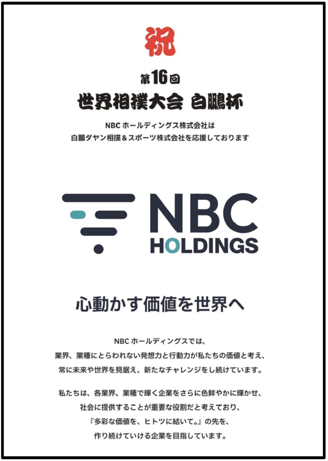 NBCホールディングス株式会社(以下、「NBCホールディングス」)は、2026年2月7日(土)、8日(日)にトヨタアリーナ東京にて開催されました、「第16回 世界相撲大会 白鵬杯 HAKUHO CUP 2026」において協賛いたしましたことをお知らせいたします。